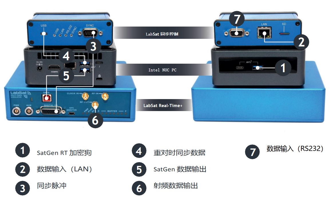 LabSat Real-Time+ 系统结合了 LabSat Real-Time+ 模拟器、LabSat Syncbox (同步控制盒)、英特尔 NUC PC (计算机) 和 SatGen 实时 (Real-Time) + 模拟软件。