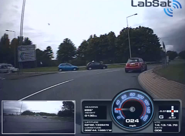 Die Video-VBOX wird einfach zur gleichen Zeit wie LabSat im Testfahrzeug platziert, und die interne GPS-Einheit versieht das Video mit einem Zeitstempel, damit die HF-Daten bei der Wiedergabe mit dem Video synchronisiert werden können.
